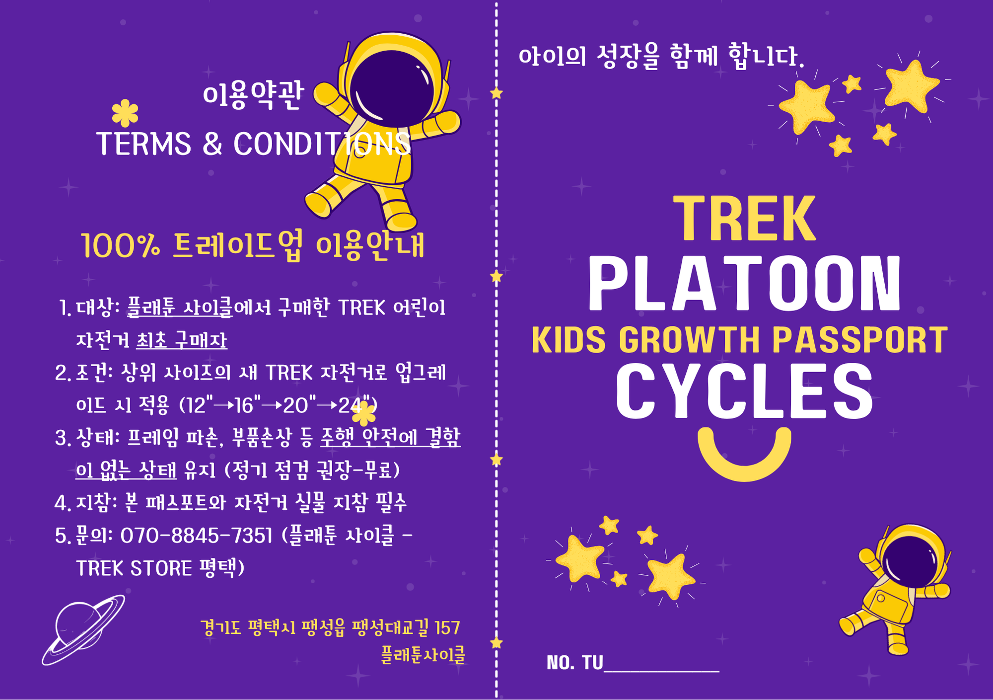 내용: 플래툰 사이클에서 구매한 Trek 어린이 자전거를 2년 이후 반납하고 다음 사이즈로 업그레이드 시, 기존 구매가 100%를 크레딧으로 인정해 드립니다.